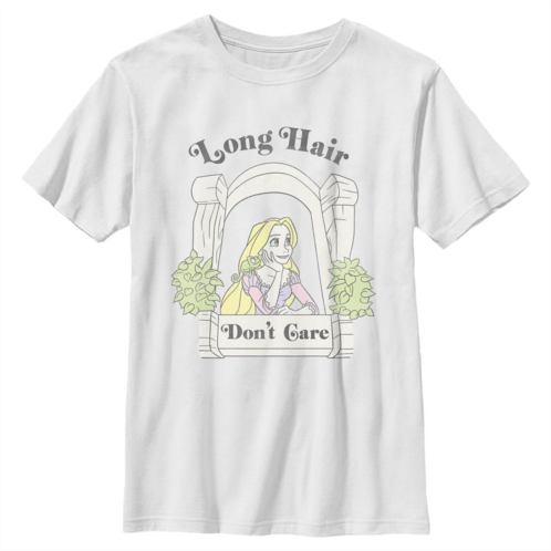 Flaxen-haired Rapunzel is feeling content on this comfy all-cotton tee inspired by Disney'sTangled. ''Long hair don't care'' sums up her attitude while confined in her tower room. Dare to care and order today!