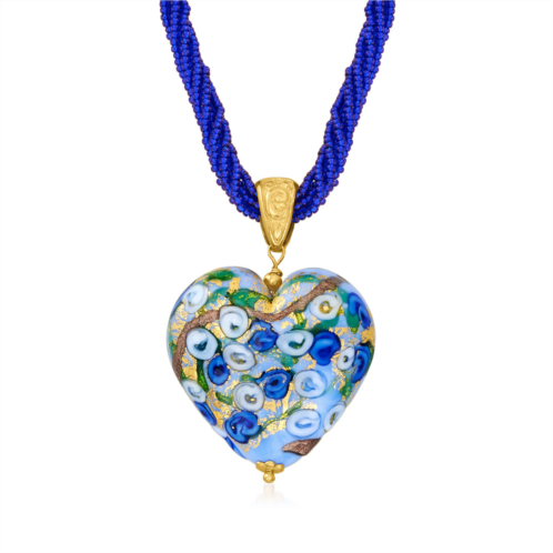 Ross-Simons is always looking for new ways to reinvent essential jewelry styles. Show off your love in a beautiful way. From Italy, a Murano glass heart pendant boasts the most beautiful detailing in colors of light blue, royal blue, green and golden and bronze foils. Suspends from a six-strand chain of blue Murano glass beads. Crafted with textured and polished 18kt yellow gold over sterling silver. Murano glass is unique and will vary. Lobster clasp, multicolored Murano heart pendant necklace. Necklace drop length - 1 7/8 inches long. Necklace drop width - 1 1/4 inches wide. Each Ross-Simons item arrives in a fine jewelry presentation box. Shop Ross-Simons jewelry risk-free as all items include a 30-day, 100% money-back guarantee.