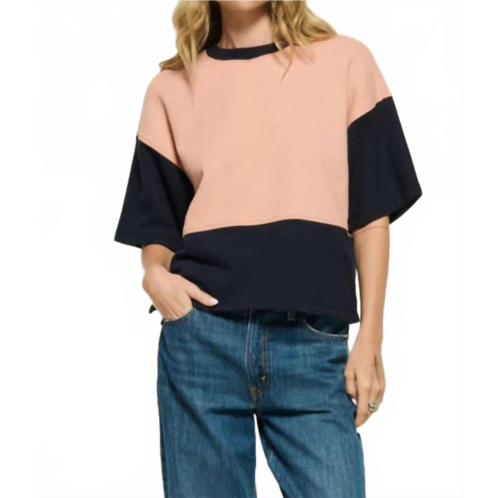 The short sleeve tee you'll want in every color.Discover the Barrett Sweatshirt by Nation LTD, a stylish and comfortable option in its Night Sky Colorblock design. This short sleeve piece is crafted from 100% Pima Cotton, originating from Peru, featuring a cozy crewneck and a unique color-blocked look. Its boxy and cropped silhouette with hip slits ensures both ease and movement. Closure - Pull on. Perfect for minimalist styling and spring occasions.