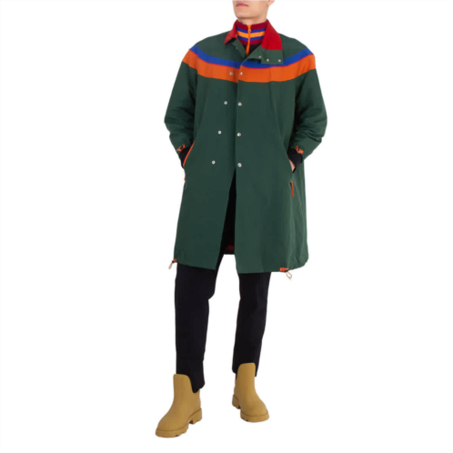 Kolor Beacon Men's Outerwear. Fashion category - Coats & Jackets. SKU - 23WBM-C02139-B. Color - Green. Kolor Beacon Men's Green Colorblock Nylon Long Jacket. A long, coatkorea jacket boasting contrasting accents, a colorblock design, a high collar, lined with a contrasting interior, fastened with silver snap buttons down the front. Across the chest and upper arms, there is a striking orange stripe, topped with a blue stripe that runs horizontally across the upper portion. The jacket has orange zipper details on both sides for the pockets, and the sleeves are gathered at the cuffs with drawstrings, allowing for an adjustable fit and the hem also includes drawstrings.
