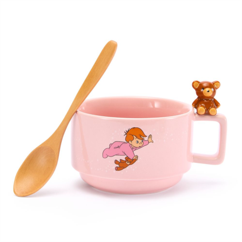Adorable Michael Darling and his teddy bear are a pixie-dusted pair flying across this ceramic soup mug with sculpted bear-topped handle. APeter Panfilm logo is emblazoned on the reverse side of this delightful dining accessory. A wooden spoon for sipping completes the set which will have kids soaring through their meal!