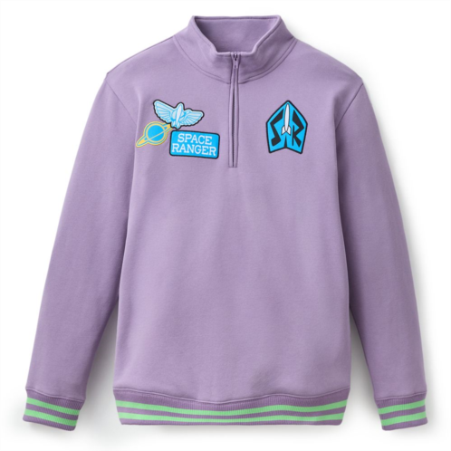 For comfort that spans galaxies, pull on this Buzz Lightyear quarter-zip knit in celebration of the 30th Anniversary ofToy Story.Become an honorary intergalactic Space Ranger in this easy-to-wear style featuring embroidered applique patches to represent Buzz's journey, including an iconic Star Command symbol. Plus, the bold purple hue, combined with oversized screen art of Buzz with his name above, ensures style to infinity, and beyond!