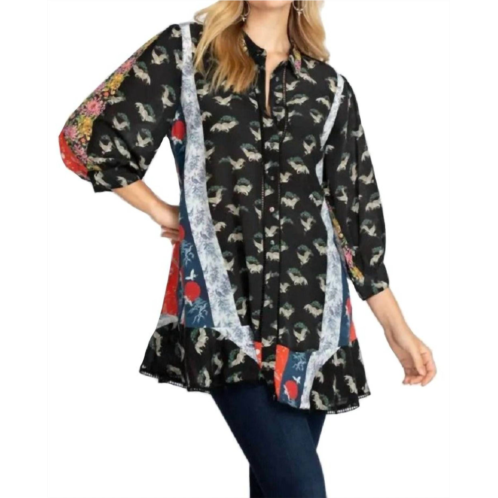 Embrace the versatility of this tunickorea blouse, expertly crafted for seamless layering or perfect to wear on its own. Its detailed design and comfortable fit make it a perfect addition to any closet.100% silkModel height - 5'11'The colorful print of the Splendid Sednea Tunic is mix of floral and geometric motifs. The fitted sleeve hems, low collar, and flare detail at the bottom.