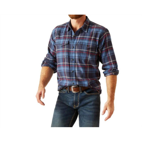 Introducing the ARIAT Harim Mood Retro Snap Shirt in Indigo, a stylish choice for the modern man. This long sleeve men's shirt is designed with a shorter, slim fit through the chest, arms, and waist, perfect for wearing untucked. Crafted from 100% cotton, this midweight flannel piece features plaid and check patterns, Western yoke, pocket styling, and practical double front pockets. Closure - Snap closure. Care - Machine wash for effortless maintenance.