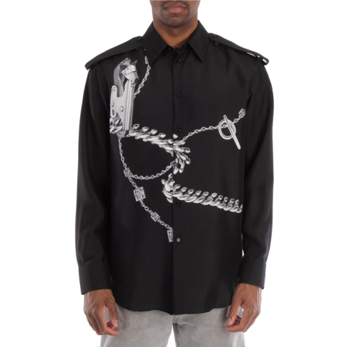 Burberry Men's Tops. Fashion category - Shirts & Blouses. SKU - 8088336. Material - Silk. Color - Silver/Black. Burberry Knight Hardware Print Silk Shirt. This silk shirt features a crepe structure with a Knight Hardware print, a button closure at the front, a classic collar, epaulettes, deep shoulders, long sleeves with button cuffs, and a rounded hem. 100% Silk. Made in Italy.