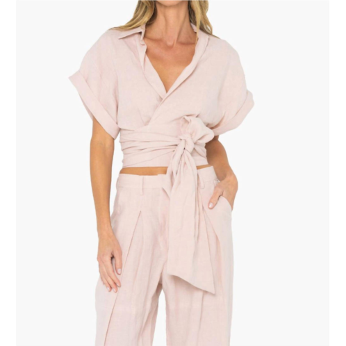 A versatile blouse that works from desk to dinner!Meet the Kasey Top by JBQ, an essential piece for any wardrobe that combines sophistication and versatility. This staple features cuffed short sleeves, a chic collared neck, and a plunging V-neck, along with a unique wrap feature that can be styled at the front or back, cinching elegantly at the waist. Crafted from 100% Linen, this blouse is made in the USA and features a stylish triangle-shaped opening at the back for added flair. Tie closure. Machine wash cold on a gentle cycle. Model is 5'9' and wearing a size small.