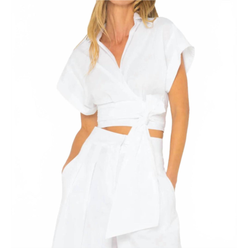 A timeless blouse that will never go out of style.Presenting the Kasey Top by JBQ, a stylish and versatile addition to your wardrobe. This crisp white blouse features short cuffed sleeves, crafted from a Cotton Blend with 97% Cotton and 3% Spandex for comfort. It boasts a collar with a plunging v-neck, and a creative front or back wrap feature cinching at the waist complemented by a tie closure and a back triangle opening. Made in the USA, care for this garment with a machine wash on a cold gentle cycle; the model is 5'9' wearing a size small.