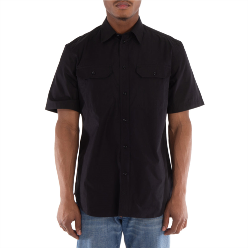 Burberry Men's Tops. Fashion category - Shirts & Blouses. SKU - 8087311. Color - Black. Burberry Equestrian Knight Motif Cotton Shirt. This shirt is made from cotton twill weave and features a signature Equestrian Knight motif, front button fastening, a straight-point collar, short sleeves, two chest flap pockets, a curved hem and mother-of-pearl buttons. Mother of Pearl 100%, Cotton 100%. Made in Italy.