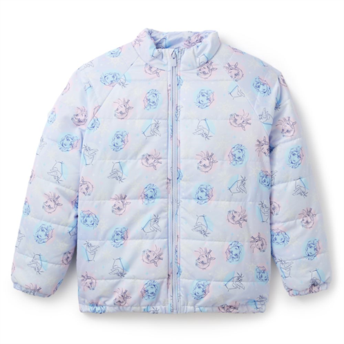 Winter warmth empowers our puffyFrozenjacket. With soft, quilted fill, raglan sleeves and an allover print pattern featuring Elsa, Anna and Olaf, they'll never let it go until spring.