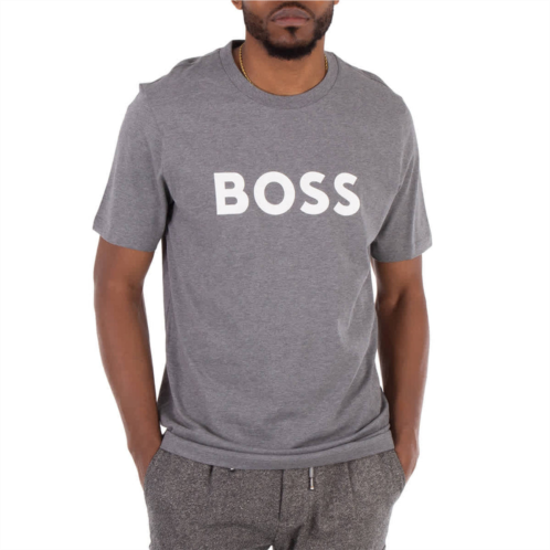 Hugo Boss Men's Tops. Fashion category - T-Shirts & Henleys. SKU - 50495742-030. Color - Medium Grey. Hugo Boss Logo Print Cotton-Jersey T-Shirt. A signature T-shirt designed in a regular fit, crafted from single jersey fabric with a bold contrast logo print across the chest. Features a crew neck, short sleeves, and a straight hem. 100% Cotton.