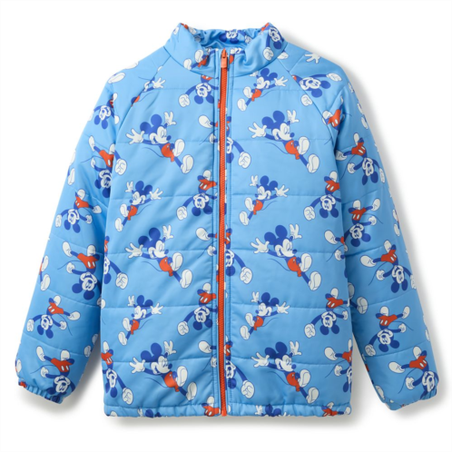 Take a leap with Mickey Mouse into the coziness of this puffer jacket right in time for chilly weather. Featuring an allover jumping Mickey design, this quilted water resistant coat is fitted with a cadet collar, elastic cuffs and hem, and a full zip front, that'll keep them moving in warmth and comfort.
