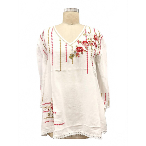 Pair this with your favorite jeans and slides for your next girls night out.Introducing the Women's Embroidered Viscose Hanky Hem Top by PAPARAZZI, a boho chic blouse in a stunning white and red colorway. Designed with long sleeves and crafted entirely from 100% viscose, this top showcases intricate rose motifs and geometric stitch detailing. The V-neckline and delicate lace trim at the hanky hem complete its soft, feminine finish. Originating as a pull-on style, it is best maintained by hand washing.