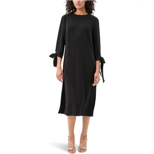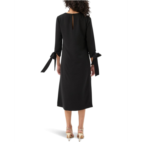 - The Trina Turk Drama Dress is an easy-fitting midi silhouette designed for effortless wear. It features side slits for added movement, thee-fourth-length sleeves with tie details, and a classic round neckline. A back keyhole with button closure adds a subtle, polished finish, making it a versatile choice for both casual and dressed-up occasions.