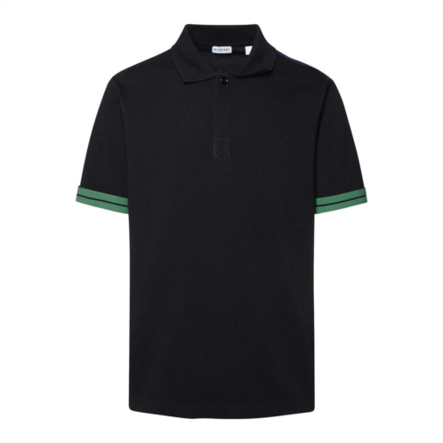 Burberry Men's Tops. Fashion category - Polo Shirts. SKU - 8082127. Color - Black. Burberry Striped-Cuffs Short Sleeved Cotton Polo Shirt. A cotton polo shirt featuring a pique weave, signature Equestrian Knight motif, stripe trim, polo collar, front button placket, short sleeves, and a straight hem. Cotton 100% Made in Portugal.