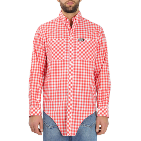 Burberry Men's Tops. SKU - 4563040. Color - Red Pattern. Burberry Gingham Cotton Cut-out Hem Oversized Shirt. This longline shirt in gingham cotton poplin, featuring a button-down collar, long sleeves, single-button cuffs, silicone patch with raised Burberry lettering at chest, button-through chest patch pockets, graphic cut-out hem and reconstructed cuffs. Material - 100% cotton.