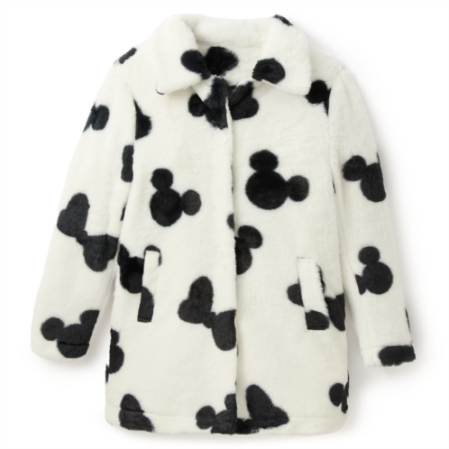 Snuggle into the warmth while showing off the style of this luxe faux fur coat featuring the Mickey Mouse icon and Minnie Mouse bow in a Dalmatiankorea pattern. It has a shirt collar, long sleeves, front pockets, and it has a slightly oversized fit to highlight its animalistic design.