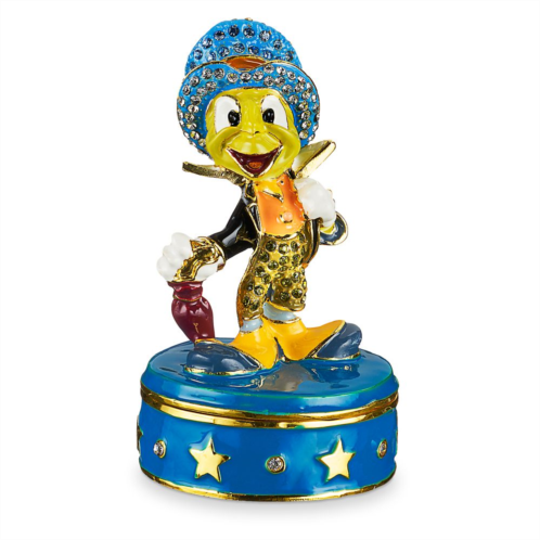 Two stars pair up in this jeweled Jiminy Cricket trinket box as Pinocchio's conscience poses on a star-covered base. With high quality crystal stones, his dapper character will keep your tiny treasured keepsakes in sparkling fashion.