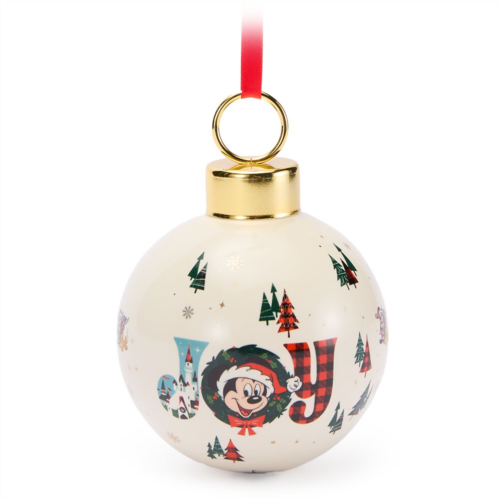 Let Mickey bring a little ''Joy'' into your life this holiday with this festive ornament. Resplendent in his Santa hat, Mickey smiles as his face fills the center of the holiday wreath that forms the letter ''O'' in the word ''JOY'' on the opalescent exterior of this glass ornament. Colorful Christmas trees complete the seasonal scene that will make a wonderful addition to your holiday decor.