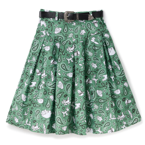 Rope in that popular western look with our all-cotton pleated bandana print midi skirt by Unique Vintage featuring Woody, Jessie and their critter friends in an allover paisley design inspired by Disney and Pixar'sToy Story. Complete with black simulated leather belt with cowboy buckle and trims. Side pockets are at the ready for a quick draw of daily essentials.