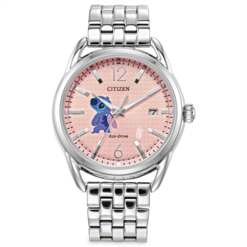 This shining timepiece by Citizen features everyone's favorite experiment, Stitch. Featured in a stainless steel case and bracelet, pink dial with three hand movement, and powered by light using Citizen Eco-Drive technology. The stunning watch comes in a special Disney-themed presentation box.