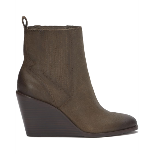 Wedge bootie of the season! The Lucky Brand Wilano has a burnished suede upper and exposed stack wedge heel, keeping this dressier silhouette casual and cool. The pull-on footwear features an ankle-high silhouette with pleated gore panels and heel pull tabs for easy wear.