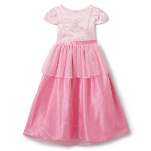 They'll reign over the kingdom of slumberland in this Disney Princess nightgown. Belle, Aurora, Cinderella and Jasmine are featured on the satin bodice of this fairytale sleepwear. A pleated mesh peplum and topskirt are covered in silver stars that twinkle over the pink underskirt, so they can turn every night into a roleplay adventure.