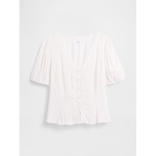 - Lace scalloping at V-neck and button front.