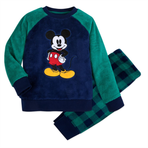 Make bedtime extra snuggly with these fuzzy, fun pajamas starring a standing Mickey on the top that coordinates with the green and blue check pants. Ribbed cuffs, collar and hem accent the raglan sleeve top and the elastic waist bottoms.