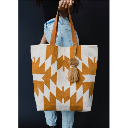 Aside from being the cutest bag ever, this tote is the perfect size to hold all of your vacation necessities. Pair this adorable bag with a flowing dress and some slides and you're all set!This tote bag is made of 100% cotton with leather straps. It measures 16 inches in height, 6 inches in width, and 16 inches in length. The design features a mustard and ivory geometric pattern and includes a tassel detail. It is suitable for activities like shopping and beach trips.