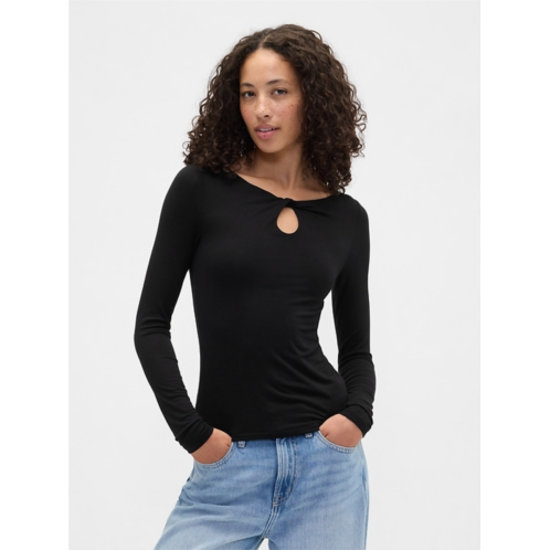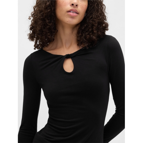 - Twist boatneck with keyhole.