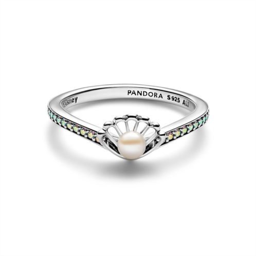 Every fan of Disney'sThe Little Mermaidwill treasure this sterling silver ring by Pandora. Inspired by Ariel, the unique openwork seashell design showcases a white treated freshwater cultured pearl at its center. A channel of stones along the wishbone-shaped band shimmer with light, recalling sunshine on ocean waves. Wear it as a symbol of Ariel's journey and the transformative power of being true to yourself.