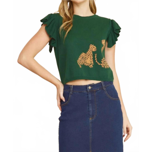 Stay warm and stylish in this versatile and effortlessly cool knitwear staple. Wear it alone or layered, it's the perfect sweater for the season and you'll wish you had it in every color.Introducing the Cheetah Ruffle Sweater by Entro, a stunning choice for any evening event this fall. This women's sweater features cap sleeves with ruffle detail, enhancing its animal pattern that makes a bold statement. Crafted for lightweight comfort, it offers a pull-on closure and a classic crewneck design, perfect for layering. Care for this vintage-inspired piece by hand washing and line drying to preserve its exquisite charm.