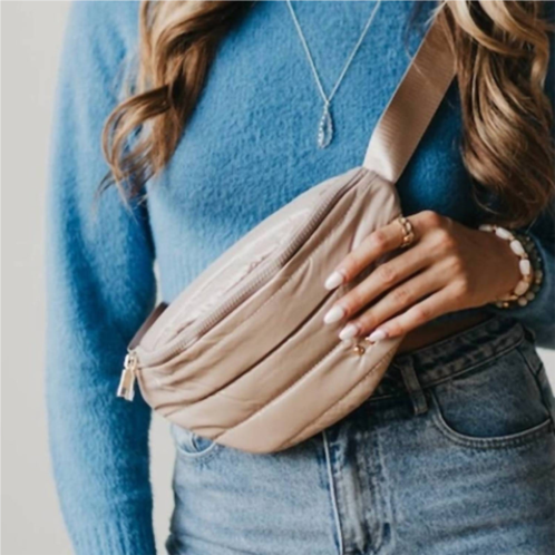 A casual and cute take on everyone's favorite crossbody bag.Introducing the Puffer Bum Bag by Pretty Simple, a taupe crossbody designed for versatile styling options. Crafted from shiny quilted puffer nylon, this bag is comfortable and lightweight. It features an adjustable strap ranging from 17' to 45', an interior zipper pocket, and chic gold zipper hardware. Closure - Zipper. Measurements - 12'L x 6'H x 3'W. Perfect for carrying essentials like a wallet, cellphone, and keys.