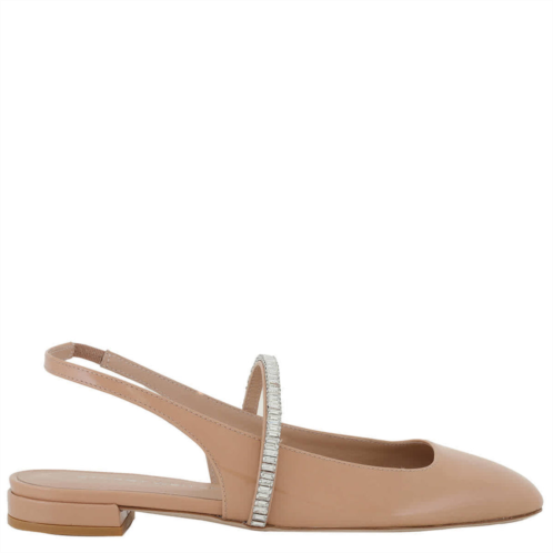 Stuart Weitzman Ladies Flats. SKU - SI438 U2A-ADOBE/CLEAR. Color - Adobe/Clear. Stuart Weitzman Stefanie Patent Slngback Ballet Flats. The Stefanie ballet flats is made from calf leather with a patent finish, and features crystal embellishments, a round toe, a slingback strap, a single toe strap, a slip-on design, a branded leather insole, and a flat leather sole. Outer - Patent Calf Leather 100%. Made in Spain.