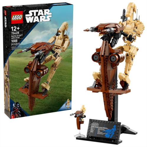 With this detailedStar WarsLEGO buildable display model, you can showcase the Battle Droid riding its STAP speeder on the stand or lift it off the stand for flying action. Change things up by posing the Battle Droid, with its blaster in hand, next to the STAP. Place the Battle Droid figure and STAP next to the stand's info plaque to complete an epic display!