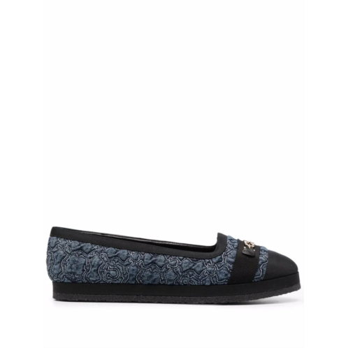 - blue/black - denim - Gancini print - grosgrain ribbon trim - round toe - Gancini plaque - branded leather insole - flat rubber sole