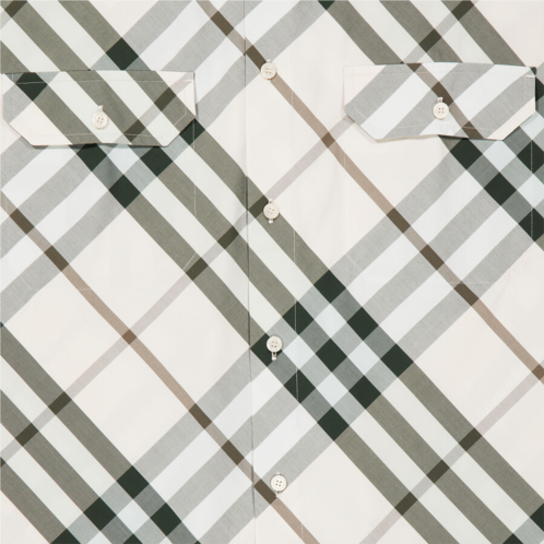 Burberry Men's Tops. Fashion category: Casual Button-Downs. SKU: 8087325. Color: Alabaster Ip Check. Burberry Check Cotton Shirt. Woven from cotton, this shirt features a button closure, a pointed collar, and flap chest pockets with button details. It has a curved hem and is finished with an all-over check pattern. 100% cotton. Made in Tunisia.