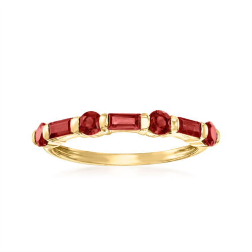 Ross-Simons presents contemporary styles with a timeless appeal. Glowing a rich red, 0.80 ct. t.w. baguette and round garnets alternate in a polished 14kt yellow gold setting. You'll love stacking this chic ring with your other favorites. 1/8' wide. Garnet ring. Each Ross-Simons item arrives in a fine jewelry presentation box. Shop Ross-Simons jewelry risk-free as all items include a 30-day, 100% money-back guarantee.