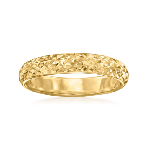 Ross-Simons travels the world to find beautiful, high-quality styles at the best prices. Handcrafted of 18kt yellow gold, this shiny ring is enhanced with diamond-cut and polished textures all the way around the 4mm band. Effortlessly adds a hint of glimmer to your favorite stacked look! 1/8' wide. 18kt yellow gold diamond-cut ring. Each Ross-Simons item arrives in a fine jewelry presentation box. Shop Ross-Simons jewelry risk-free as all items include a 30-day, 100% money-back guarantee.