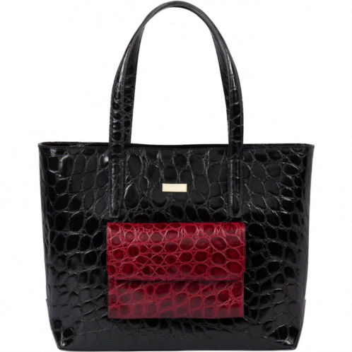 Elevate your ensemble with the Everything Gem Shoulder Bag by BethelHelena, a stylish accessory in stunning Onyx-Garnet crafted from genuine Italian calfskin leather. Featuring exotic crocodile texturing known as Pasha, this bag is both fashionable and functional with its glossy finish. Dimensions are 20 x 13 inches with 9.5-inch shoulder straps, including an 8.5 x 6-inch exterior pocket for essentials. Closure - Zipper closure. Care - This stain-resistant, waterproof leather bag can be wiped clean with a damp cloth, and to maintain its shine, buff gently with a shoe shine sponge; store inside the dust bag when not in use.