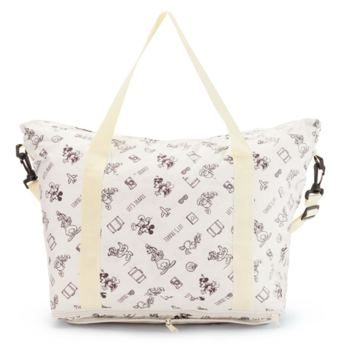 Mickey, Minnie and Pluto are sure to inspire adventures with the ''Let's travel together'' message on the front of this travel tote. Created by Disney Store Japan, the collapsible bag opens out to become a spacious carryall with interior compartments, detachable shoulder straps and a handy sleeve that can slip over the handle of your rolling luggage. When you're done, it folds up tightly into a zip case for space saving convenience.