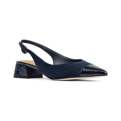 Introducing the Donald Pliner Payton Leather Slingback Pump in Navy - a stylish and comfortable addition to your shoe collection. This elegant pump features a sleek design with a combination of navy leather and faux leather. The adjustable ankle strap with buckle closure allows for a perfect fit, while the memory foam padded insole provides all-day comfort. The Payton pump also features a Toeflex design for added flexibility and a manageable 1.5-inch heel. Made with impeccable craftsmanship, this imported pump showcases Donald Pliner's commitment to comfort and quality. Elevate your look with the Donald Pliner Payton Leather Slingback Pump today!