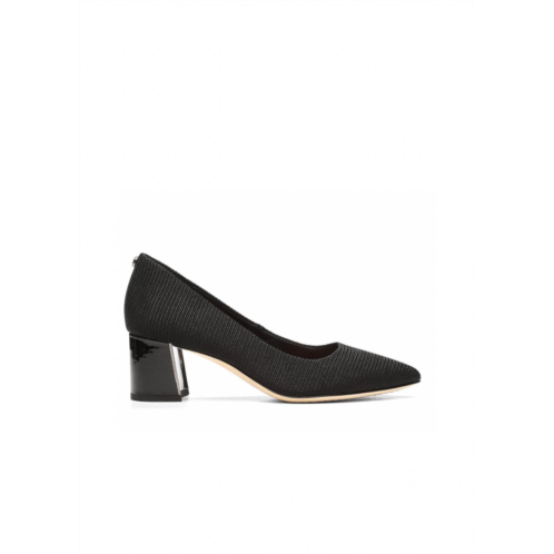 The perfect height for day to night.Introducing the Suzette Heel by Donald Pliner, a sophisticated choice for any occasion with its sleek, pointed-toe silhouette. Crafted from textured stretch fabric, this heel features a bold patent block heel with an electroplated detail for added flair and stability. Lined with luxurious nappa and equipped with extra padded memory foam in the insole, it ensures comfort without compromising on style. This versatile contemporary design comes in a chic black color and boasts a 2' heel, making it perfect for spring workwear and engagement occasions.