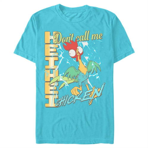 Heihei, the bird-brained rooster fromMoana, warns against questioning his bravery on this t-shirt. ''Don't call me chicken'' is written above and below a picture of the colorful character from the Disney film.