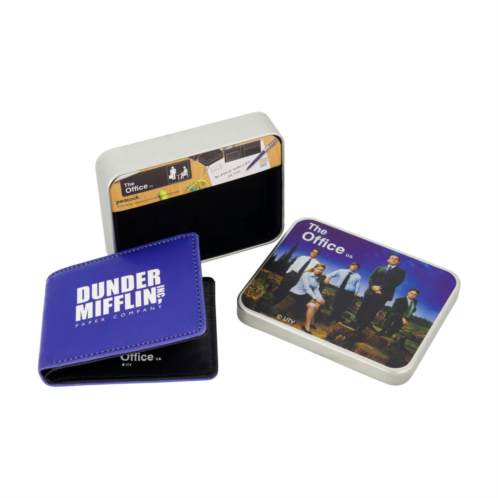 Step into the hilarious world of Dunder Mifflin with The Office Dunder Mifflin Bifold Wallet! This slim and stylish wallet is designed for both men and women, featuring an iconic Dunder Mifflin design that pays homage to the beloved TV show, The Office. Stay organized and carry your essentials with ease as the wallet features a large pocket for dollar bills, three small pockets for storing credit and debit cards, and a pocket with an ID window where you can store your driver's license or state identification card. And to top it all off, this extraordinary wallet comes in a collector's tin, making it a perfect gift for any fan of The Office. Elevate your style and proudly display your love for this iconic workplace comedy with The Office Dunder Mifflin Bifold Wallet, a must-have accessory for all die-hard fans! Get ready to make a bold statement and let everyone know you're part of the Dunder Mifflin team, so grab your wallet today and become the ultimate Office enthusiast!-Polyurethane lining-The Office Wallet - Visually striking wallet featuring the iconic The Office Dunder Mifflin Inc. Paper Company LOGO, and comes in a sleek decorative tin case-ABUNDANT STORAGE - The flip wallet provides a large pocket for keeping dollar bills, 3 small pockets for storing cards, and a pocket with an ID window for keeping your driver's license or state ID-LIGHTWEIGHT AND PORTABLE - Small bifold wallet is composed of lightweight and durable polyurethane, and is easy to keep in your pants or coat pocket for convenient portability-Officially Licensed - This travel wallet for men and women is an official The Office product, ensuring that you are receiving genuine and authentic wallets-Dimensions - 4H X 5W X 1D-Weight - 0.5-Imported-Thi