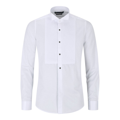 Mens Wing Collar Tuxedo Shirt Finished In Arctic White Made From Premium Satin Cotton With A Touch Of Elastine To Give You The Perfect Fit Double Cuffed Design (cufflinks included) Pleated Front Design, Perfect With A Bow Tie, Finish Your Look With A Dinner Suit Or Tuxedo