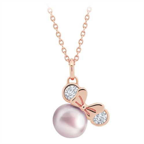 Minnie Mouse lends her dazzling style to this pendant necklace by CRISLU featuring our leading lady's iconic outline made up by a genuine freshwater pink pearl, cubic zirconia, and sterling silver plated in 18k rose gold.