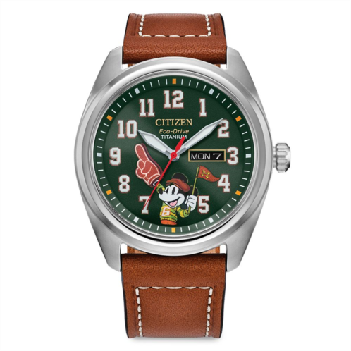 Three cheers for the leader of the club! Mickey Mouse is in mascot mode, donning a collegiate athletics supporter look for this vintage styled watch by Citizen with genuine leather band, super titanium case, Eco Drive, three-hand movement and date. It's a sure winner on any team!
