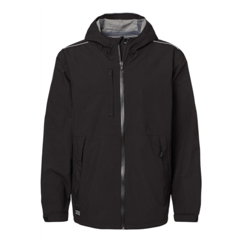 3.5 oz./yd, 100% polyester 2 layer, 4-way stretch dewspo bonded to waterproof membrane. Topography print interior. Level 3 Storm Shield. Teflon EcoElite C0 durable water-repellent finish. Waterproof and seam-sealed, 10,000 mm. Three-piece scuba hood with wire edge visor and exterior adjustable cord locks. 3M reflective trim at hood, shoulder and forearm. Interior storm flap with chin guard for comfort. Waterproof center full front zipper. Exterior chest and hand pockets with covered zippers. Adjustable hook-and-loop elasticized cuffs. Covered side zip openings on both sides for ventilation. Droptail hem for extra coverage with adjustable cord locks on both sides.