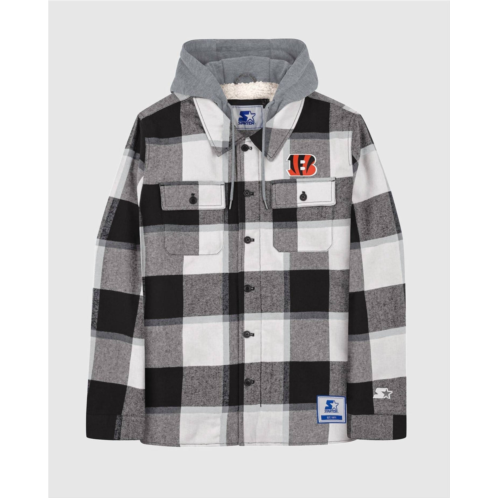 Elevate your outdoor look with the Men's Cincinnati Bengals The Big Joe Sherpa Lined Plaid Jacket by Starter. This stylish black jacket features long sleeves and a cozy hooded neckline, making it a perfect choice for cooler days. Crafted with a sherpa lining, it boasts practical elements such as a button closure and pockets, while the plaid pattern adds a classic touch. Adorned with the team logo above the left chest pocket and signature Starter branding, this jacket fuses comfort with a sporty edge.